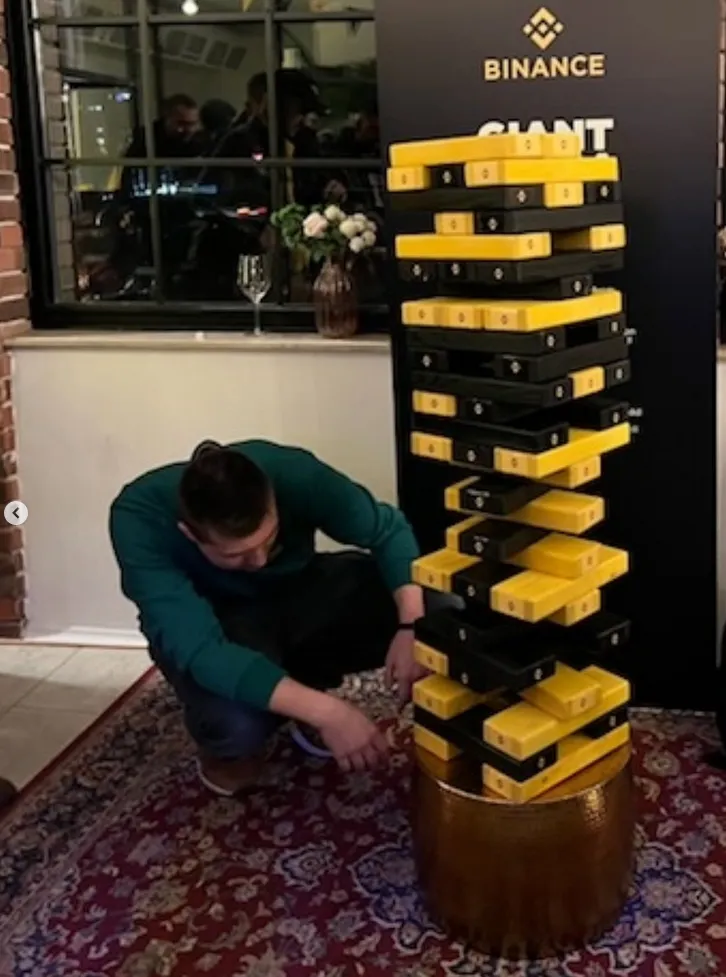 Kripto menjalnica Binance nam je zaupala izdelavo personalizirane orjaške Jenge za njihov dogodek. Jenga bloki na dogodku veriženja blokov :D